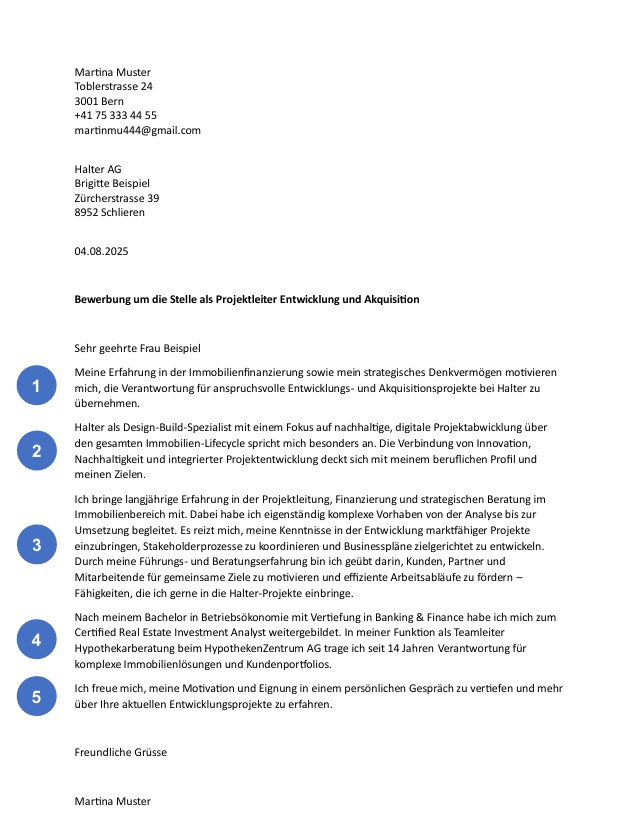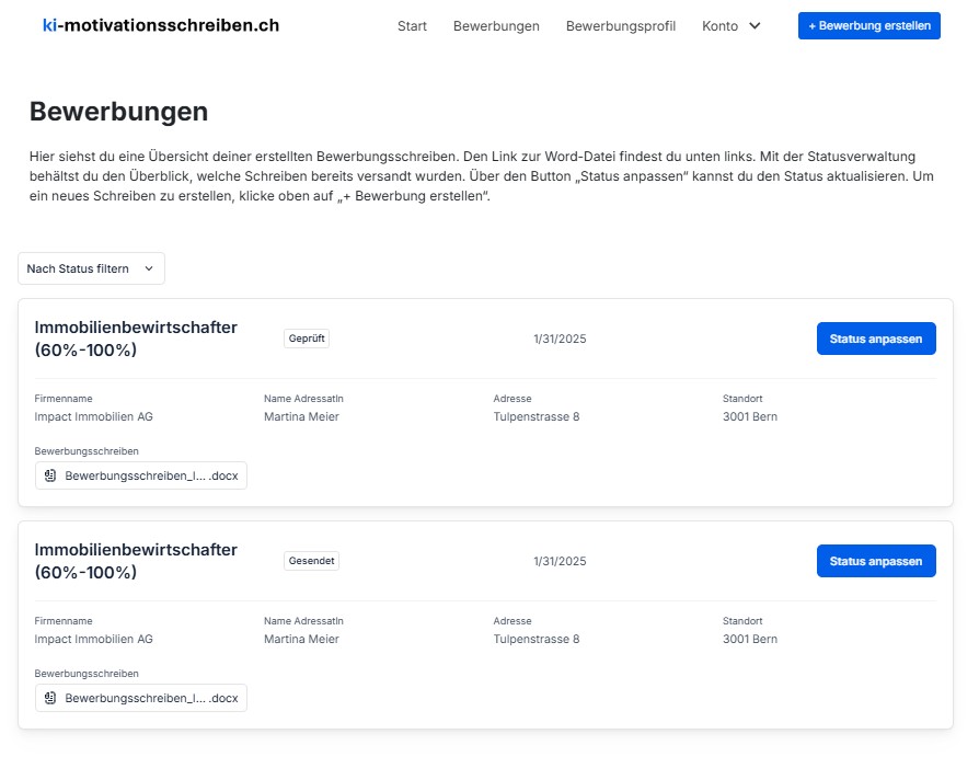 Unsere KI analysiert deinen Lebenslauf (CV) und gleicht deine Fähigkeiten und Berufserfahrungen mit den Anforderungen aus dem Stelleninserat ab. Daraus entsteht ein individueller Abschnitt, der deine Motivation und Eignung klar aufzeigt.