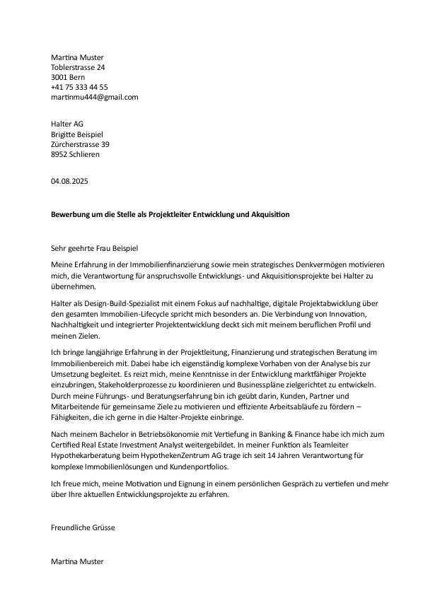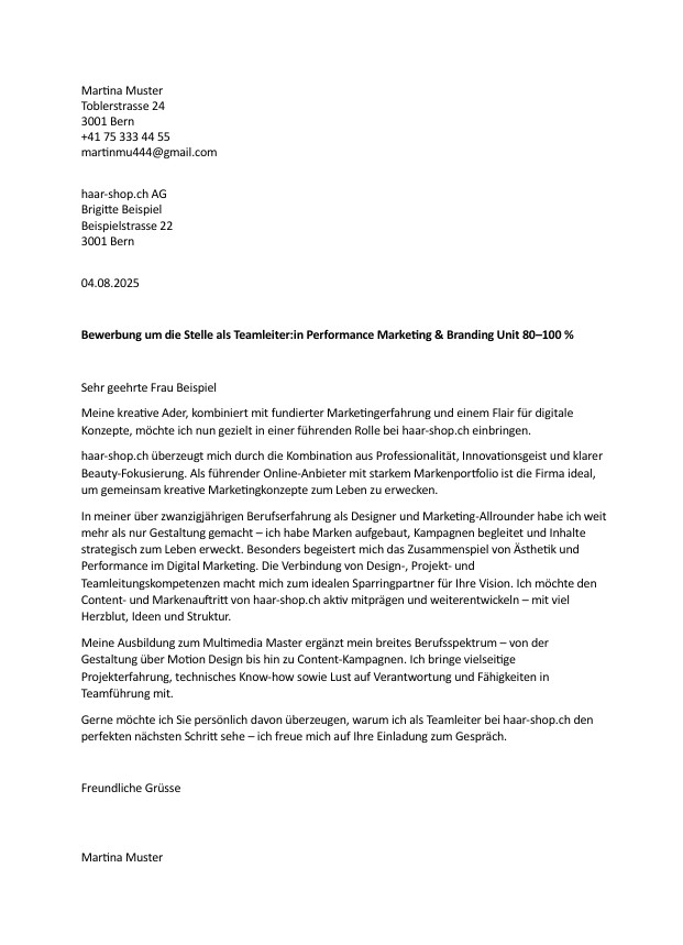 Unsere KI schreibt eine Einleitung, in der die Bewerbung bestätigt und das Interesse an der Stelle formuliert wird. Du kannst zusätzlich die Quelle des Inserats ergänzen (z. B. Jobplattform oder Unternehmenswebsite).